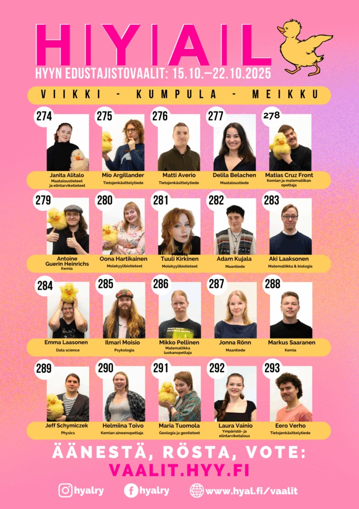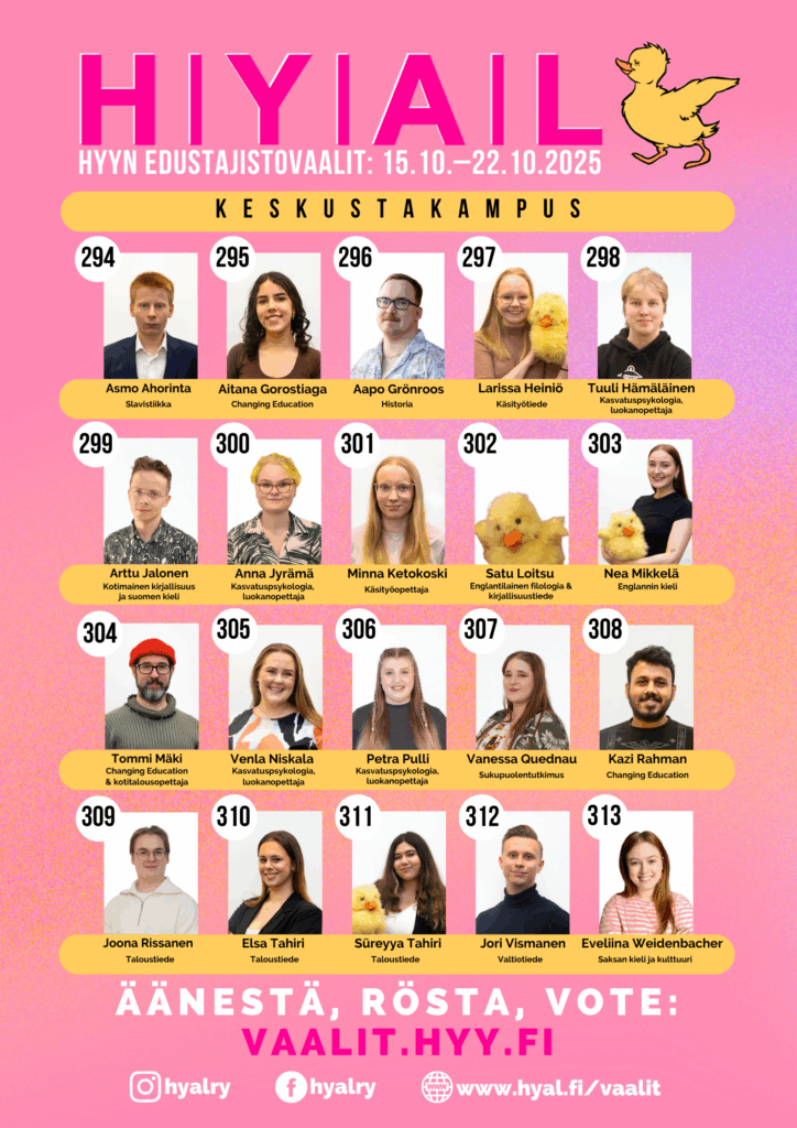 HYAL is a non-party related, interdisciplinary student organization and HYY political representative group. HYAL defends the well-being and sense of community of students at HYY, as well as strong student advocacy at the University of Helsinki and in society.
